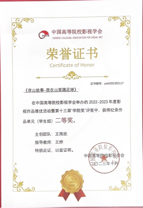 在中国高校影视学会年度推优活动暨第十三届“学院奖”评奖中,我院教师王烨指导的2019级广播电视学专业王雨欣团队创作的短片《凉山故事—我在山里踢足球》获学生组纪录片作品单元二等奖。