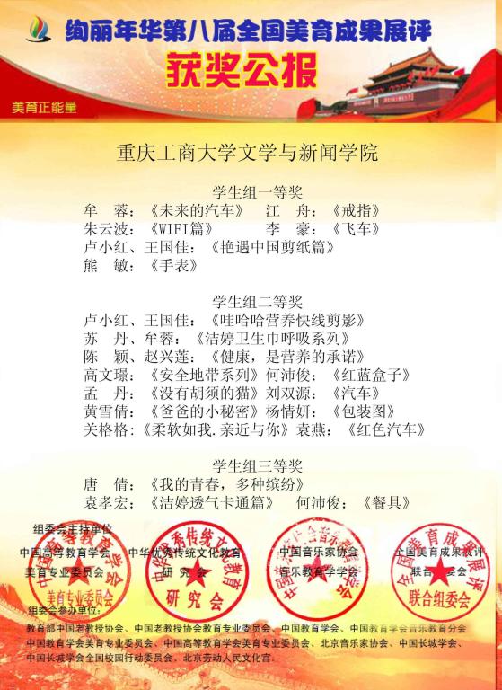 近日,“绚丽年华”第八届全国美育成果展评结果揭晓。我院广告学专业学生在马丽老师指导之下,积极提交作品并在比赛中表现突出,获得一二三等奖共20项。