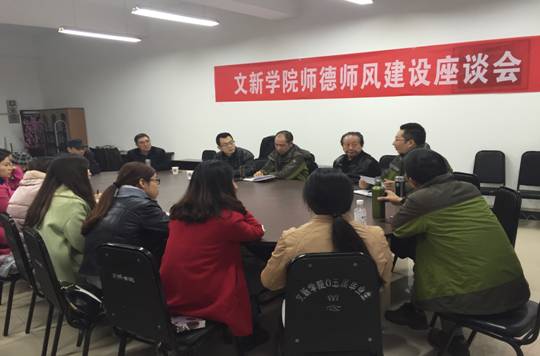 11月27日下午,文新学院在慧智楼90227会议室召开了“师德师风建设座谈会”。我校教学督导、系主任、教学团队负责人、教代会副主任、2015年新进教师、党政办、教务办、学团办及文新学院党政领导参会。会议由党总支书记段庸生主持。