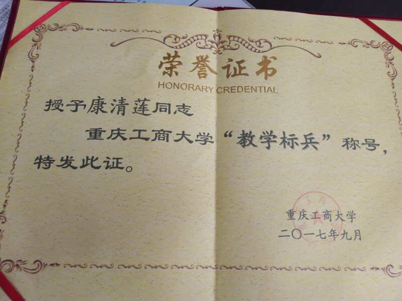 副校长柏群宣读了《关于公布重庆工商大学2016-2017学年“教师教学奖”评选结果的通知》,这是我校首次设立“教学名师奖”、“教学标兵奖”和“教学新星奖”。于2016年10月启动“教师教学奖”评选工作,经学院考查、推荐提名,材料初审、公示,专家评委初评,获奖候选人答辩,网上投票,专家评委复评,从45名申报教师中评选出15名教师获得“教师教学奖”资格,我院康清莲老师获得我校“教学标兵奖”。