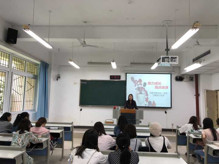 2018年4月27日,文学与新闻学院学生一支部在90202教室召开“助力成长 指点迷津”主题党日活动。邀请2014级学生党员,来自广告班的余佳音、王中生同学;新闻班崔雯婷同学;新媒体班的杜金凤同学与低年级学生交流经验,分享感悟。