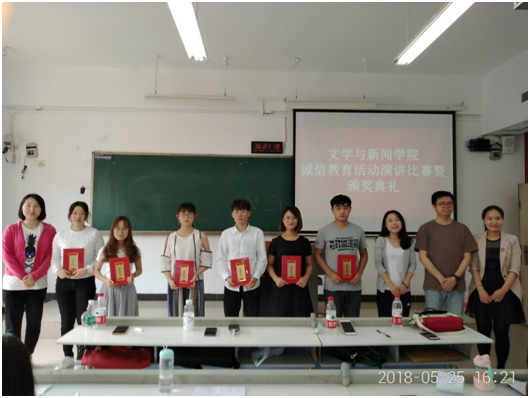 5月25日下午3时10分,由文学与新闻学院举办的“诚信”教育活动演讲比赛在慧智楼90207教室顺利举行。文新学院分团委书记、辅导员老师、15、16级贷款学生和14级贷款学生代表出席了本次比赛。