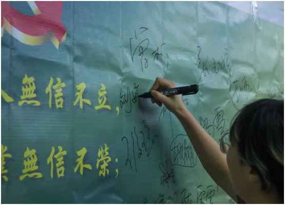 本次诚信主题活动结合文新学院专业特色,要求参赛者拍一组“诚信”主题的照片、视频或画一组图片并配150字左右的文字,通过综合点赞评论分数和匿名评分,最终有六组选手进入决赛。决赛共分为两个环节,首先到场同学郑重在诚信承诺墙上签字,表明自身立场。第二部分,六位选手分别上台对作品进行展示和介绍,选手们通过漫画、抖音视频等同学喜闻乐见的形式,表达自己的“诚信”理念和态度。现场的互动游戏“诚信接力”、“嘴巴手指不一样”等也通过分享“诚信经历”、“诚信小故事”等也让大家在欢声笑语中感受到“诚信”的力量。最终,文新学院2016级广告学专业的陈雯雯一等奖。