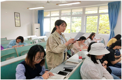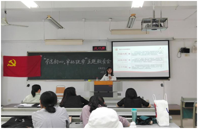 活动伊始,殷海燕老师说明了此次学习活动的目的和流程。此次主题教育活动主要分为三个板块。首先,陈方怡同学领学习近平主席在“不忘初心、牢记使命”主题教育工作会上的讲话,带领支部党员学习“不忘初心、牢记使命”的正式提出、重要意义、总要求、根本任务。其次,支部同学及老师们积极发言分享学习心得体会。最后,邹灵同学主持开展了建国70周年“我和我的祖国”进行支部学习教育活动,并进行学习总结。