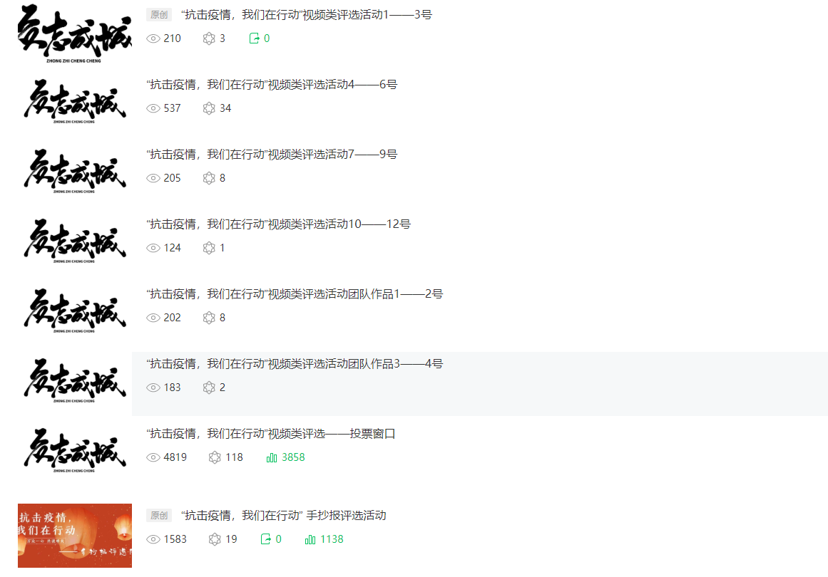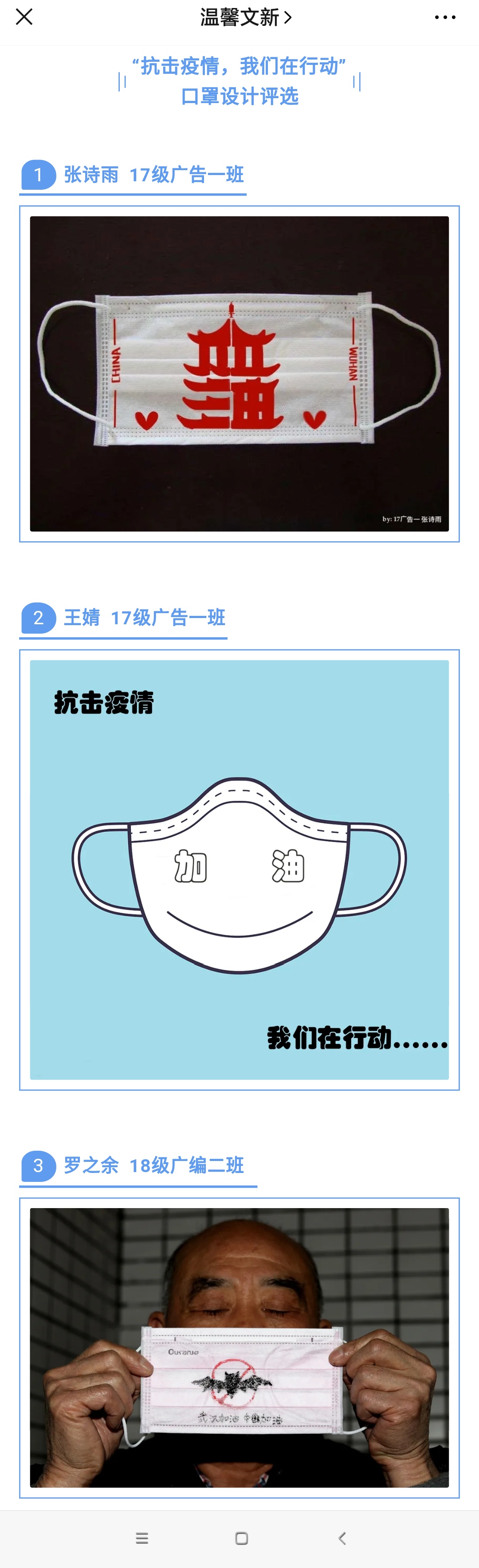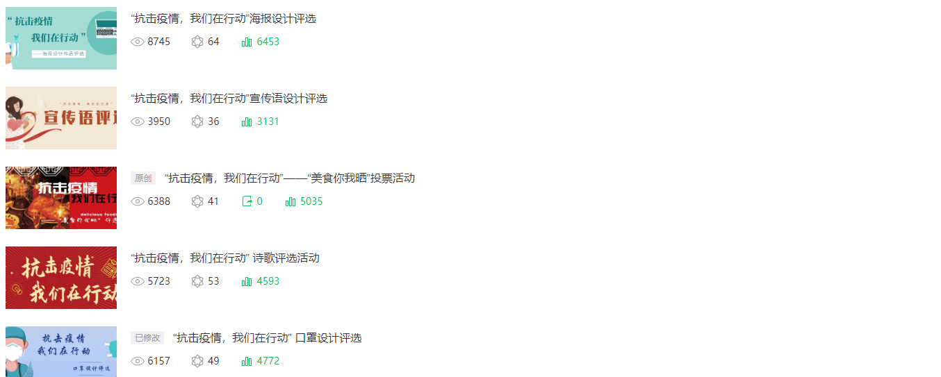 本次活动为期一个月,采用线上举行,截至2月18日,文学与新闻学院举办的“抗击疫情,我们在行动”系列活动已收集到248份作品,投稿作品分为文字类、图文类、视频类三个大类,共有宣传语、诗歌、短视频、海报设计、手抄报设计、口罩设计、美食你我晒等七个小类。投稿作品内容多为宣传防疫知识,不信谣不传谣,对此次疫情的看法,以及致敬一线最美“逆行者”等。