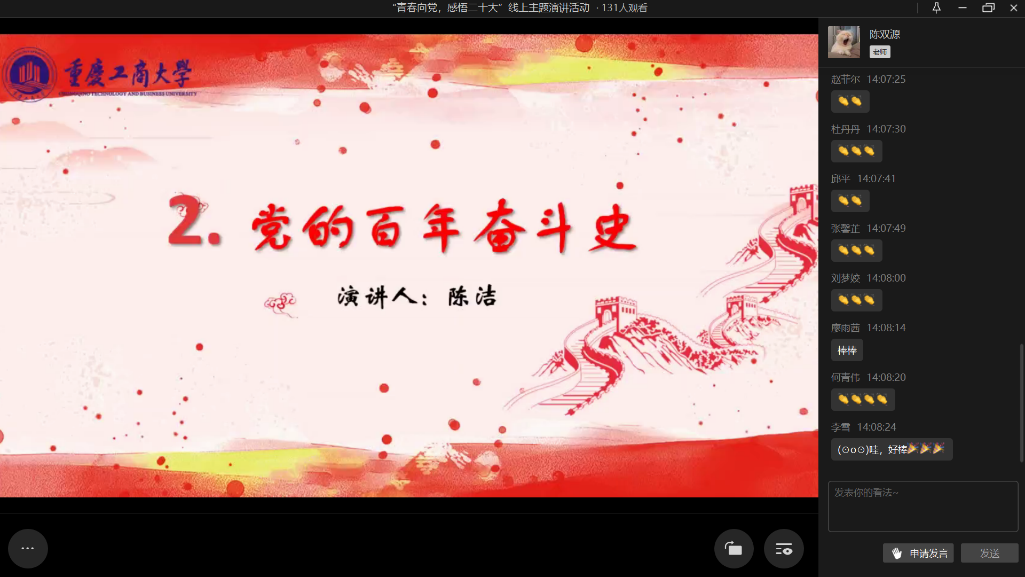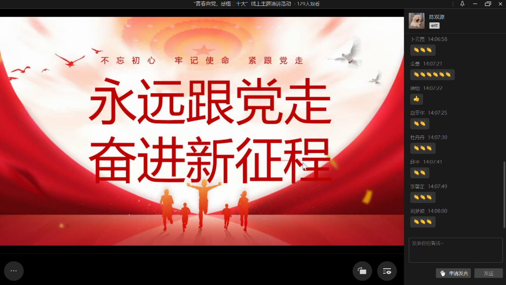 演讲期间,许多观众深有感触,自发在弹幕上发送“请党放心,强国有我”以及五星红旗的图案。分享感受的陆泯洁同学说到:“今天几位同学带领我们深入地了解了党的二十大的相关内容以及党的二十大精神,从今天的活动中,我认为我们要深学笃用习近平新时代中国特色社会主义思想,增强坚定捍卫‘两个确立’、坚决做到‘两个维护’的思想自觉和行动自觉。同时,作为新时代青年,我们要树立远大理想,勇担时代重任,自觉用党的创新理论武装头脑,坚定不移听党话、跟党走,努力成为堪当民族复兴大任的时代新人。”
