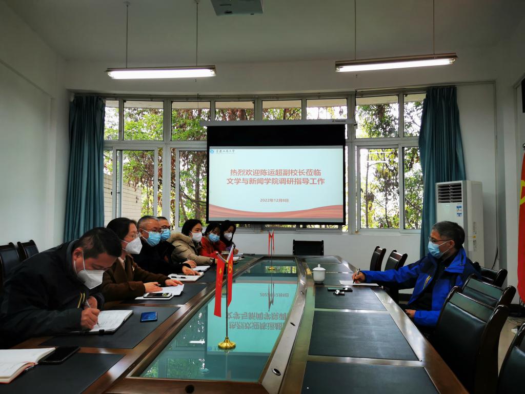 12月8日下午,学校党委常委、副校长陈运超到文学与新闻学院调研指导工作。学院党委书记于频、院长王仕勇、党委副书记程元元,以及在校工作人员共10余人参加了调研会。