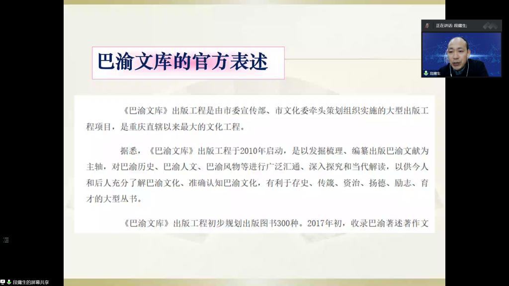 段庸生教授从《巴渝文库》出版与整理的情况展开。他谈到,智能时代到来,为地方文化的发展、提炼带来了便捷,我们面临的是数字化背景下中国文化传承可持续发展的问题。《巴渝文库》研究集中在民国与抗战时期,史料的收集整理任务繁重,大数据、数字化、智能合成、机器人处理等为典籍的面世带来了技术编辑上的改进,为古籍的整理研究带来了便捷。他鼓励学生做研究要沉淀下去,要下功夫,在占有丰富资料的基础上,寻找学术的真空领域。