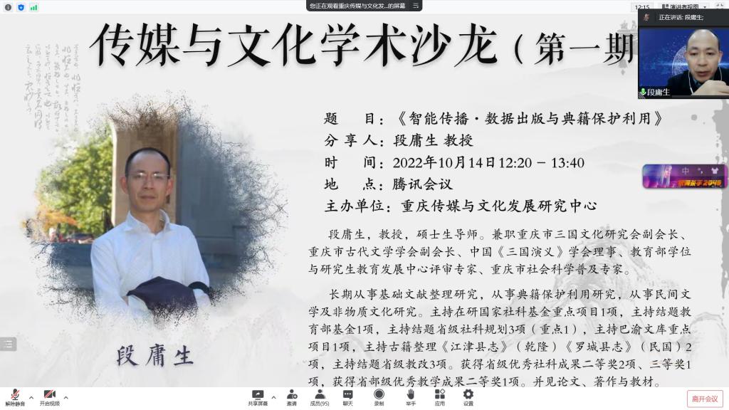 为促进学院学科建设与发展,拓展青年教师及研究生学术视野,创造师生学术交流机会,10月14日下午,文学与新闻学院重庆传媒与文化发展研究中心在腾讯会议举办了第一期传媒与文化学术沙龙。本次学术沙龙邀请了段庸生教授为我们分享《智能传播·数据出版与典籍保护利用》,学院青年教师及新闻传播学研究生参加了此次学术沙龙,沙龙由院长王仕勇主持。