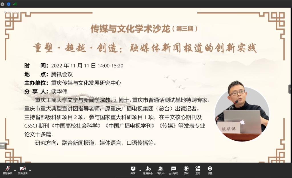 11月11日下午,文学与新闻学院重庆传媒与文化发展研究中心在腾讯会议举办了第三期传媒与文化学术沙龙。本次学术沙龙邀请了谈华伟博士为与会者分享“重塑·超越·创造:融媒体新闻报道的创新实践”。学院青年教师及新闻传播学研究生参加了此次学术沙龙。沙龙由院长王仕勇主持。