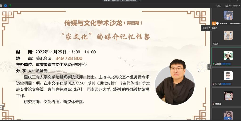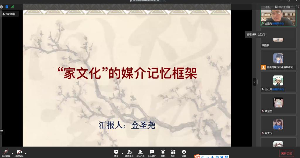 11月25日下午,文学与新闻学院与重庆传媒与文化发展研究中心在腾讯会议进行了第四期传媒与文化学术沙龙。本次学术沙龙邀请了金圣尧博士分享《“家文化”的媒介记忆框架》。学院青年教师及新闻传播学研究生参加了此次学术沙龙。沙龙由院长王仕勇主持。