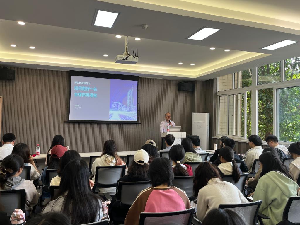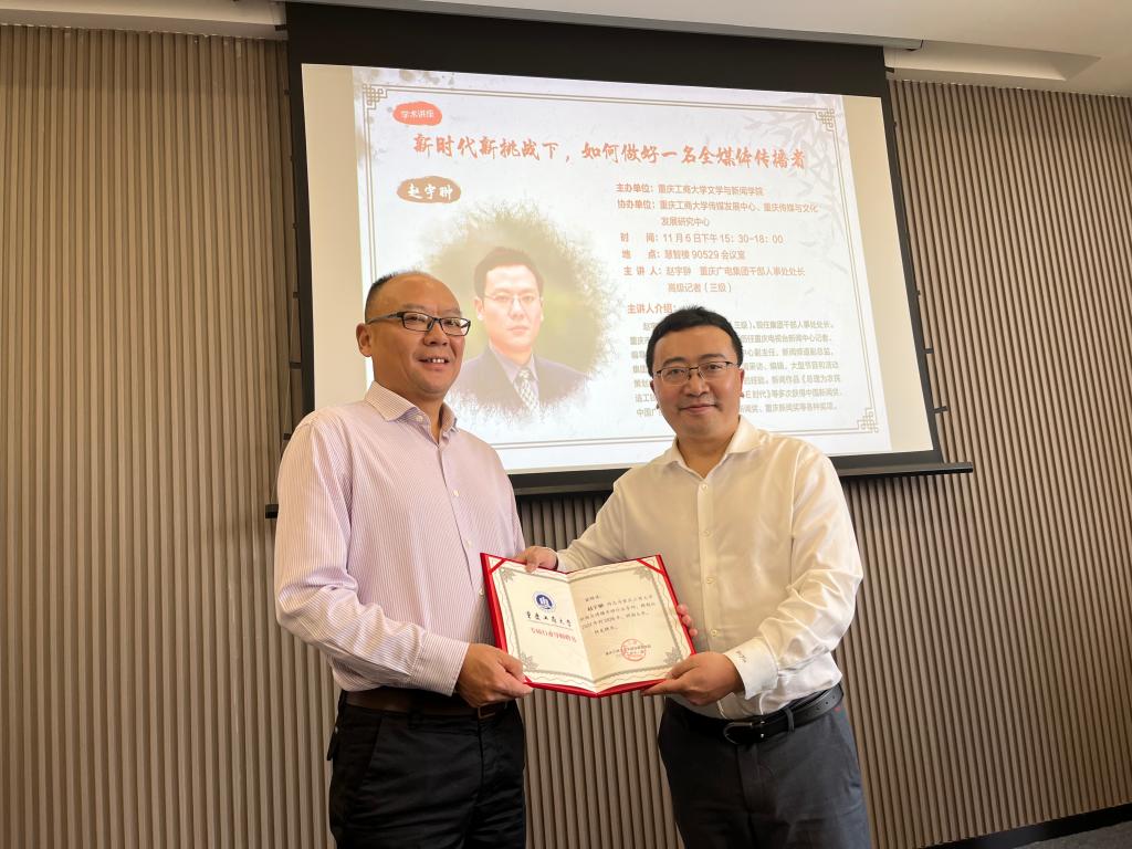 为提高学生实践能力,发展职业规划,11月6日下午,重庆广电集团干部人事处处长赵宇翀应邀到我院作《新时代新挑战下,如何做好一名全媒体传播者》专题讲座。讲座由文学与新闻学院院长殷俊教授主持。讲座正式开始前,学院为赵宇翀颁发新闻与传播专业硕士行业导师聘书。学院70余名研究生与本科生代表参加本次讲座。