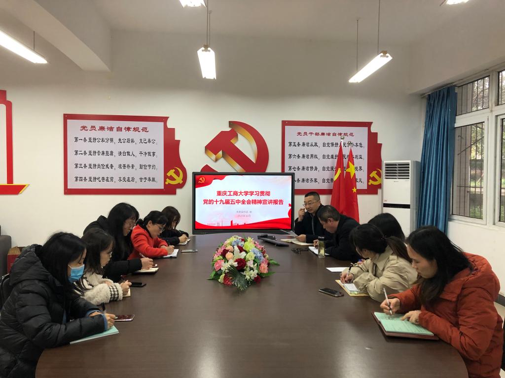 根据学校党委要求,文学与新闻学院成立了以学院分党委书记为团长,分党委委员、专职组织员、党支部书记、辅导员为成员的宣讲团,在全院开展学习贯彻十九届五中全会精神宣讲。12月9日,文学与新闻学院学习贯彻党的十九届五中全会精神首场宣讲报告会在90227会议室举行。此次宣讲报告会由学院宣讲团团长李华平作宣讲报告,全体宣讲团成员参加学习。