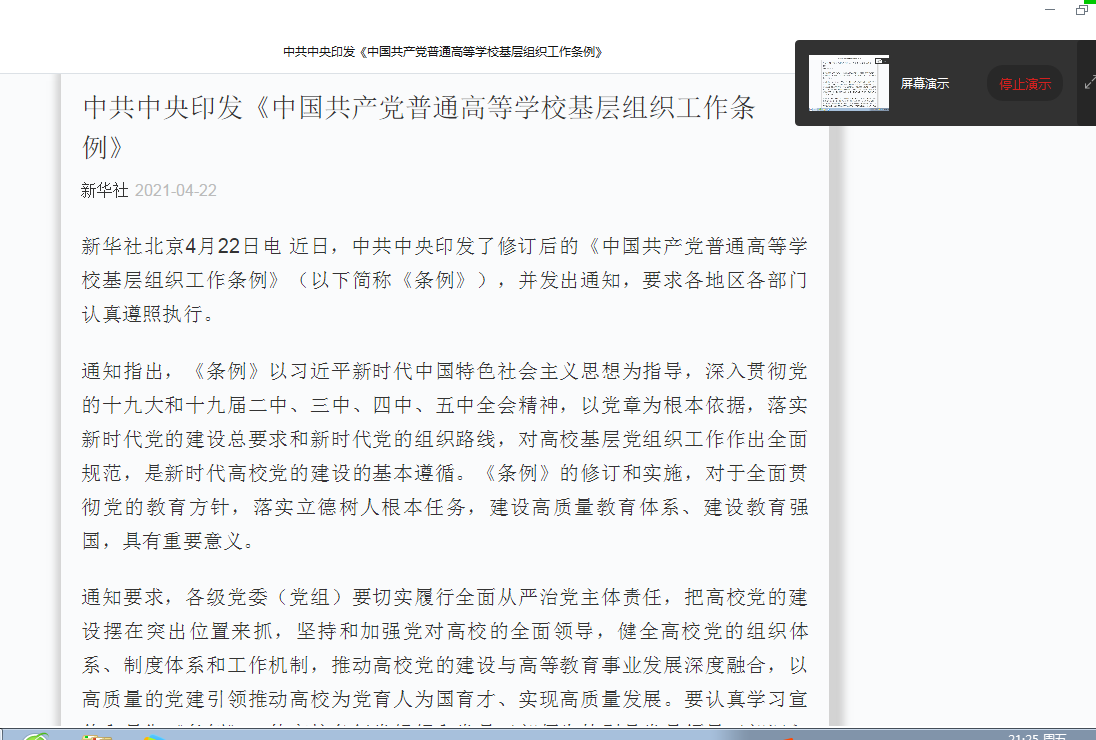 党课结束后,支部党员集中学习了《中国共产党普通高等学校基层组织工作条例》(简称《条例》),张老师对《条例》原文内容进行了领学,重点学习了《条例》中有关党支部建设的条款和内容,强调《条例》的修订和实施,对于全面贯彻党的教育方针,落实立德树人根本任务,建设高质量教育体系、建设教育强国,具有重要意义。因此要求党员同志要认真学习宣传和贯彻《条例》。