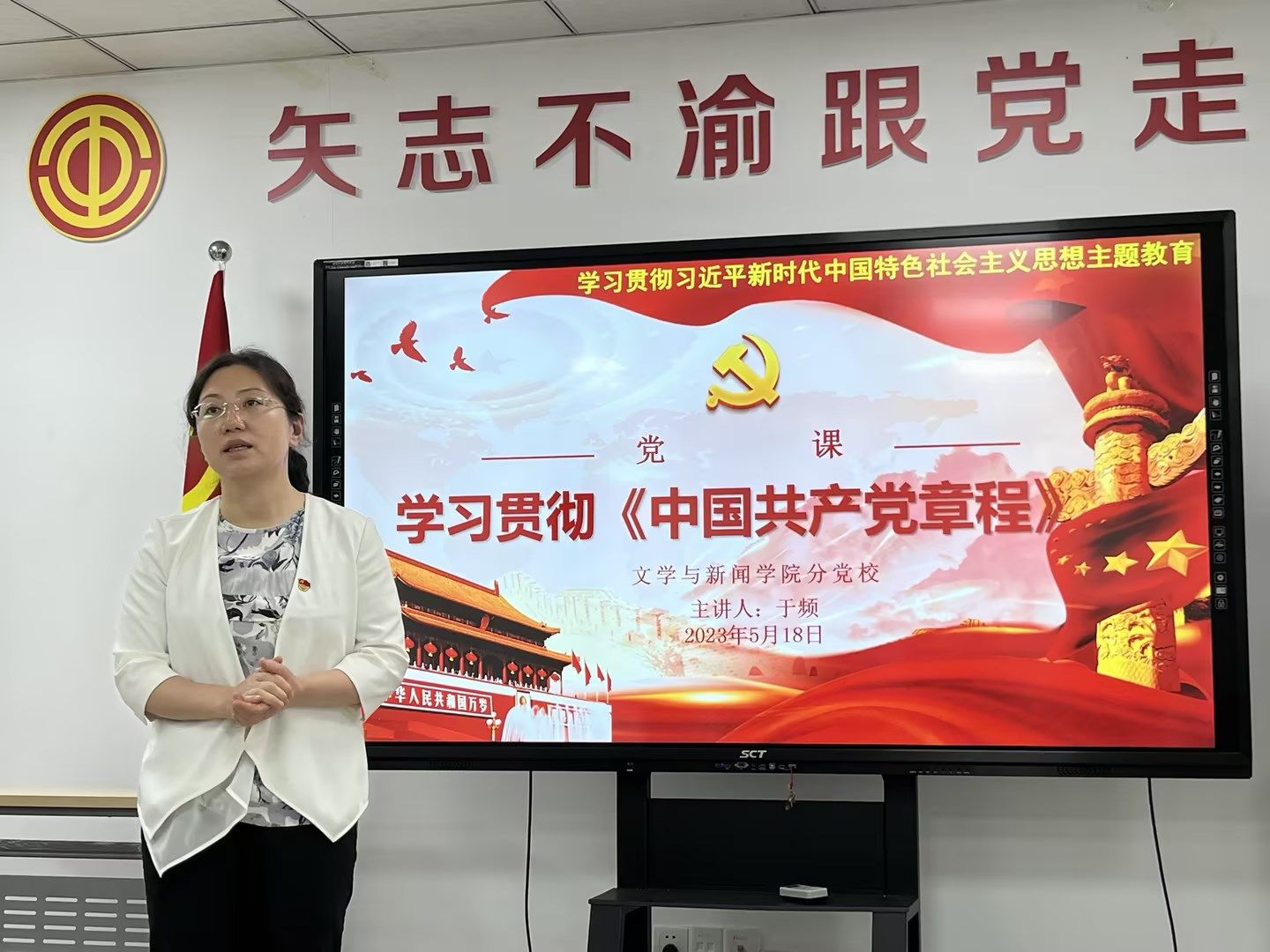 5月18日下午,文学与新闻学院学习贯彻习近平新时代中国特色社会主义思想主题教育专题党课在党群活动中心开讲,学院党委书记于频、教工第二支部书记邵茹波从不同的角度就学习贯彻《中国共产党章程》讲授党课。