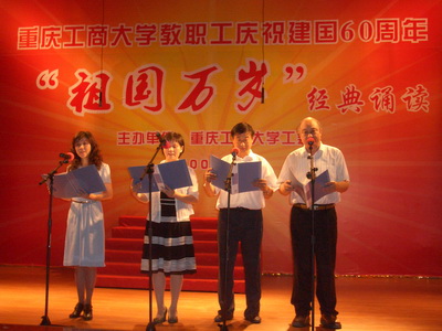 ?为庆祝建国60周年,弘扬爱国主义,共建和谐社会,激发广大师生员工“爱党、爱祖国、爱家乡”的民族自豪感,由校工会主办的 “庆祝建国60周年教职工经典诵读比赛”5月22日下午在设计艺术学院报告厅成功举行。全校各工会选送的选手进行了激烈的角逐,我院工会选送的四名选手王逸虹教授、郑敬东教授、康清莲副教授、顾瑛副教授共同朗诵的《春江花月夜》荣获二等奖第一名。