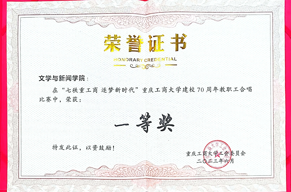 6月2日下午,重庆工商大学“七秩重工商,逐梦新时代”庆祝建校70周年教职工合唱比赛在图书馆隆重举办。我院合唱队积极参加,不负众望荣获一等奖。文学与新闻学院的老师们以乐观开朗的心态,认真的对待此次比赛。我院老师围绕时代主题,在比赛过程中,他们着装整齐歌声嘹亮,以整齐划一的上扬动作和热情饱满的精神状态,精彩演绎了曲目《万疆》,用歌声表达了对党和国家的热爱和美好祝福。最终,我院在20支参赛队伍中脱颖而出,获得本次比赛一等奖。通过此次比赛,不仅展现出了我院教师昂扬向上的斗志和朝气蓬勃的精神风貌,更坚定了大家爱党、爱国、爱校之心。