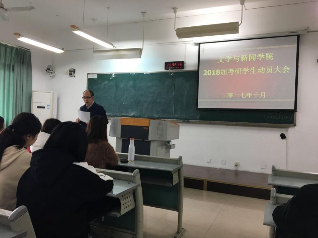 10月13日下,文学与新闻学院2018届考研动员大会在慧智楼521教室举行。文学与新闻学院分党委书记段庸生、毕业班辅导员、九十余名考研学生参加大会。会议由毕业生辅导员张小焕老师主持。
