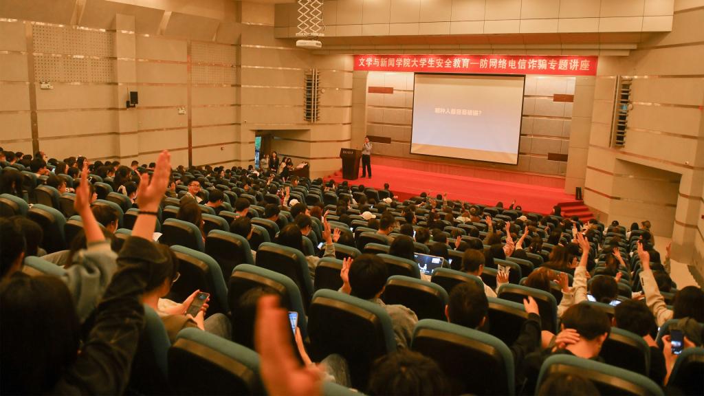 本次讲座共分为两个环节。在第一个环节中,付敏警官为在场人员介绍了易受骗群体和常见网络诈骗类型。他通过众多真实案例向在场师生展示了当前的诈骗手段以及诈骗方式,用“沉没成本”这一经济学中的原理,解释为什么人会上当受骗,并且会持续受骗;通过详细讲解“杀猪盘”骗局背后的团伙作案方式,警醒同学们要擦亮眼睛,不留贪心,同时增强识别能力和防范意识。防范电信网络诈骗,希望同学们面对各种涉及到财务往来的来电及社交媒体信息,应当做到“三不”:不信、不理、不汇款。付敏大队长生动活泼的讲解极大地吸引了同学么的注意力,风趣幽默的讲解风格更是赢得了同学们的阵阵掌声,让同学们在欢声笑语中受到了教育,增长了防诈骗知识,提升了防诈骗意识。