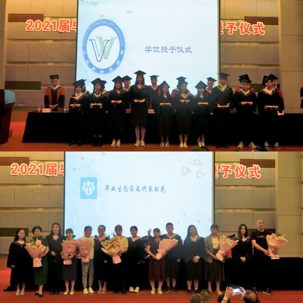 邓伟副院长宣读《文学与新闻学院关于表彰2021届优秀大学毕业生的决定》。学院教学指导委员会主任张玉霞宣读《文学与新闻学院关于2021届学生考研的决定》。