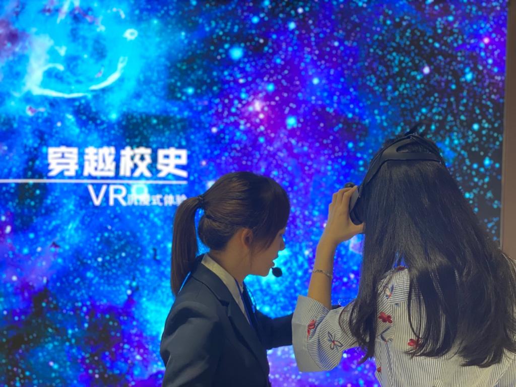 (图片为我院同学体验VR沉浸式穿越校史设备)