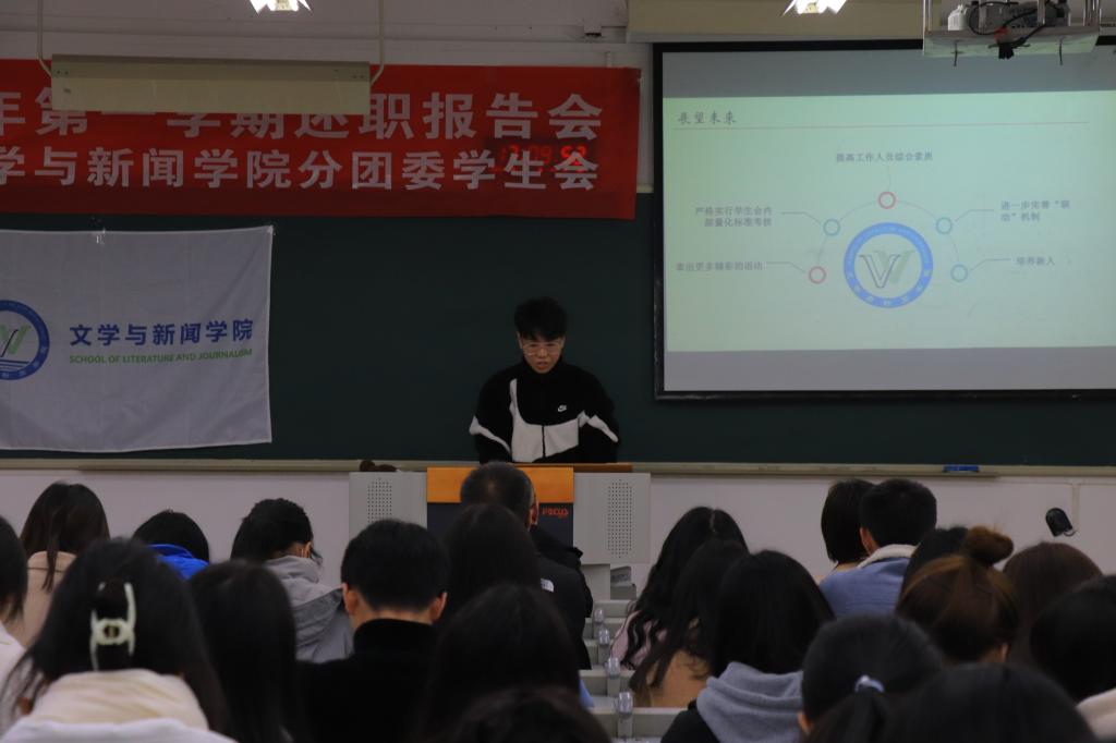 本次会议由学生会体育部负责人铁维真同学担任主持人,主席团代表孙宇斌同学从开启征程、组建团队、协同合作、展望未来四个方面对学生会主席团一学期来的工作进行了总结,并阐述了主席团来年工作计划。