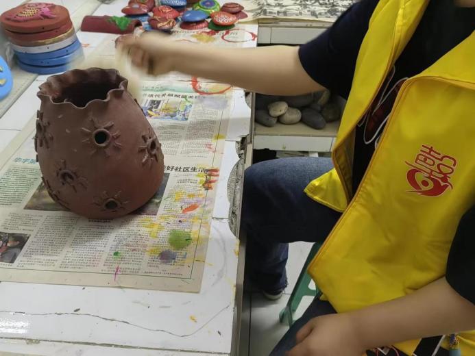 另一批志愿者在重庆市渝中区阳光职业康复园,有条不紊地按区域开展清洁工作:打扫场地,擦拭桌椅和房间,整理陶艺品,为残障人士提供更舒适的教学环境及休息环境。此外,志愿者们还学习了陶艺文创的相关知识,并进行了手工陶艺的实操,有利于更好地走进残障人士的世界,为他们送去温暖。