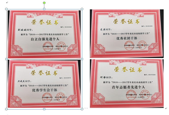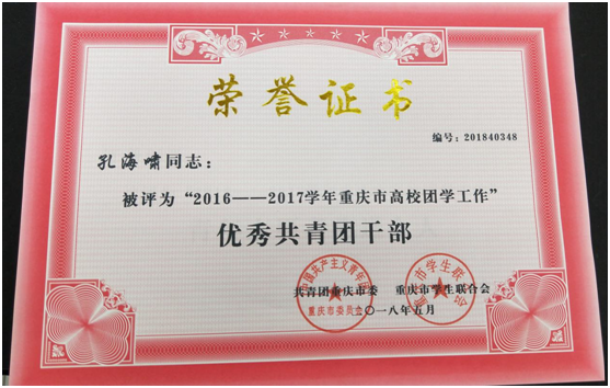 经过激烈比拼,我院孔海啸老师获评2016——2017学年重庆市高校团学工作“优秀共青团干部”荣誉称号;我院刘娇娇同学获评2016——2017学年重庆市高校团学工作“自立自强先进个人”荣誉称号;卫成杰同学获评2016——2017学年重庆市高校团学工作“优秀学生会干部”荣誉称号;龙源同学获评2016——2017学年重庆市高校团学工作“优秀社团干部”荣誉称号;何静同学获评2016——2017学年重庆市高校团学工作“青年志愿者先进个人”荣誉称号。