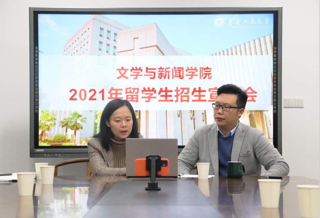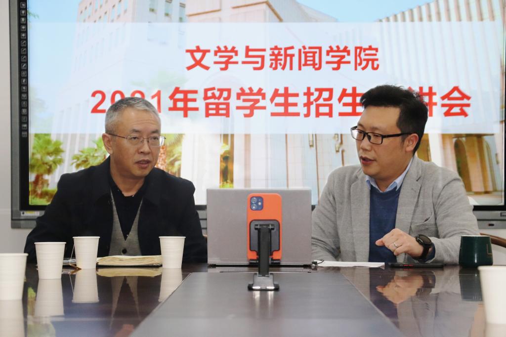 2021年4月6日下午14:30,我院在涵智楼801会议室举办了2021年外国留学生招生宣讲会。在国际合作与交流处的协助下,本次宣讲会采用网络直播形式。院长王仕勇、广播电视学系系主任王瑞林进行现场直播宣讲,留学生辅导员周晋协助直播。国际合作与交流处副处长陈昌盛和刘茜、宋旭等老师出席宣讲会,并对相关问题进行协助答疑。宣讲会由国际合作与交流处副处长陈昌盛主持,吸引了有志于报考我院硕士阶段学习的留学生通过视频实时在线积极参与。