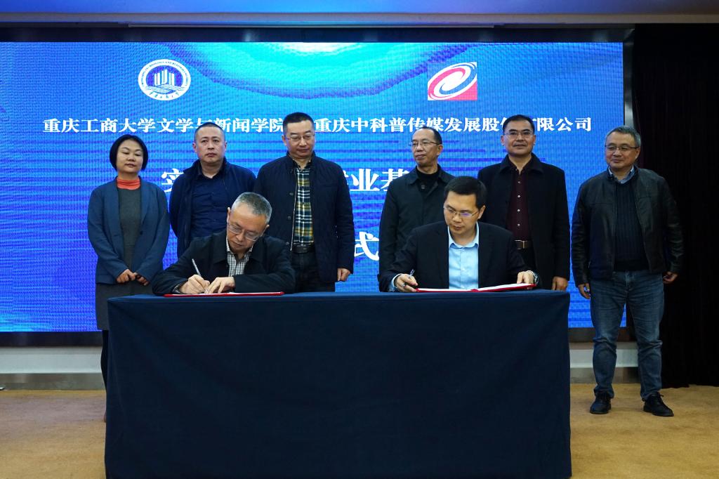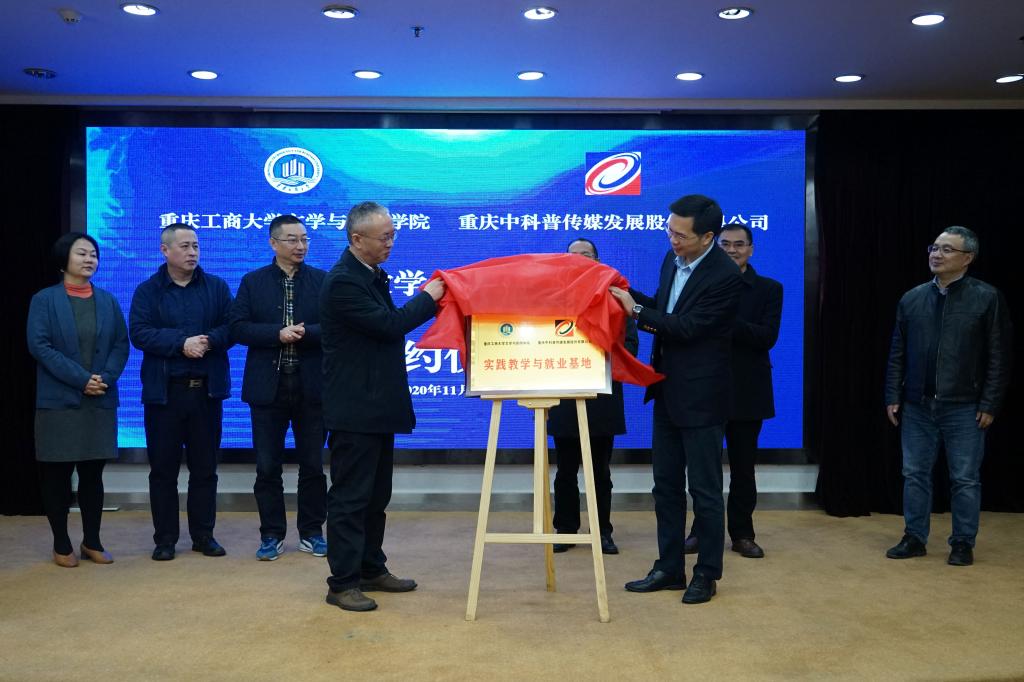 签约仪式上,王仕勇院长代表我院与重庆中科普传媒发展股份有限公司董事长金奇签订了《共建实践教学及就业基地协议书》,并为实践教学及就业基地揭牌。